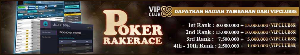 POKER RAKE RACE memberikan total hadiah sebesar Rp. 70.000.000. Hanya dengan bermain di setiap Permainan Poker favorit anda antara tanggal 1 April 2026 s/d 30 April 2026 dan apabila anda mencapai posisi TOP 10 pada LEADERBOARD, maka anda bisa mendapatkan uang tambahan dari website game tempat anda bermain dan Tambahan Khusus dari VipClub88. Jadi jangan lewatkan kesempatan yang besar ini.